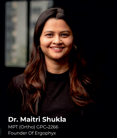 MPT (Orthopaedics), registered physiotherapist (GPC-2266), Dr. Maitri Shukla is the Founder of Ergophyx, with over 10 years of experience in physiotherapy, combining academic teaching and clinical practice with a strong focus on ergonomics and musculoskeletal health.